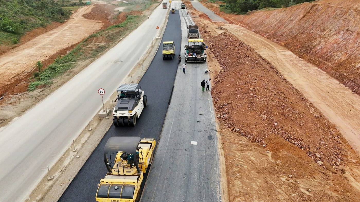 Trên công trường đang triển khai 20 mũi thi công, máy móc và nhân lực hoạt động liên tục ba ca mỗi ngày để thực hiện các hạng mục cấp phối đá dăm, bê tông nhựa, hạ tầng giao thông, hầm chui dân sinh, đường gom…hiện các nhà thầu đang tập trung vào làm mặt đường tuyến chính, nếu thời tiết thuận lợi toàn bộ mặt đường sẽ hoàn thành ngày 15/8 và thông tuyến ngày 19/8.