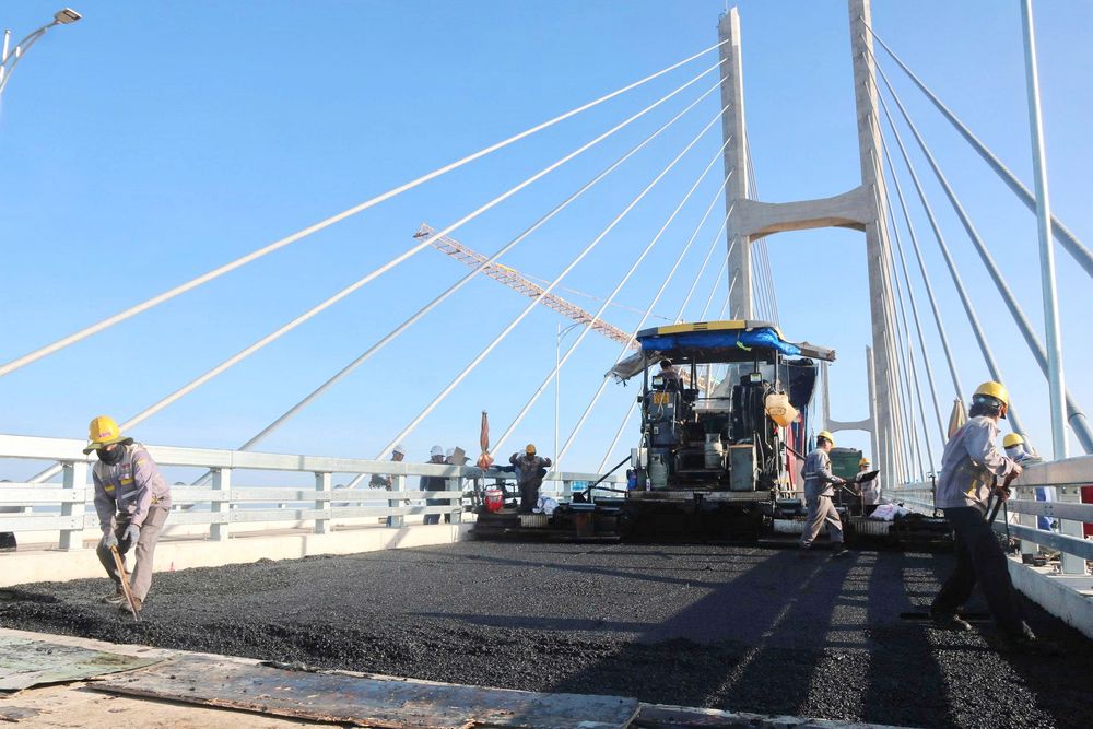 Cụ thể, phần đường đang thi công trên toàn bộ tuyến khoảng 14,2km, hoàn thành 100% công tác dỡ tải, thi công lớp cấp phối đá dăm. Thi công bê tông nhựa theo từng phân đoạn được 13,5km/14,2km. Sẽ hoàn thành toàn bộ phần tuyến, gồm đường và cầu trên tuyến trước ngày 30/7. Phần cầu đã thực hiện bê tông 5/5 cầu trên tuyến, hoàn thiện thảm bê tông nhựa mặt cầu 3/5 cầu, 2 cầu còn lại sẽ thảm bê tông nhựa trước 20/7/2025.
